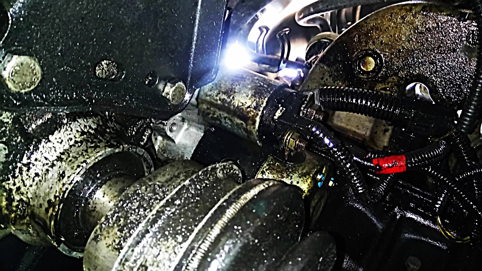 Vue par dessous la voiture, le démarreur est au même niveau que l’alternateur, mais coté conducteur. Il y a 3 câbles électriques : celui qui relie le solénoïde au moteur (il n’est donc pas nécessaire de l’enlever pour le retrait du démarreur), celui qui relie le solénoïde au pôle positif de la batterie (écrou de 13) et celui qui relie le solénoïde au neiman (pas d’écrou pour celui-ci, c’est une cosse).